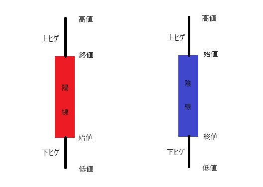 陽線・陰線、上ヒゲ、下ヒゲのイメージ図