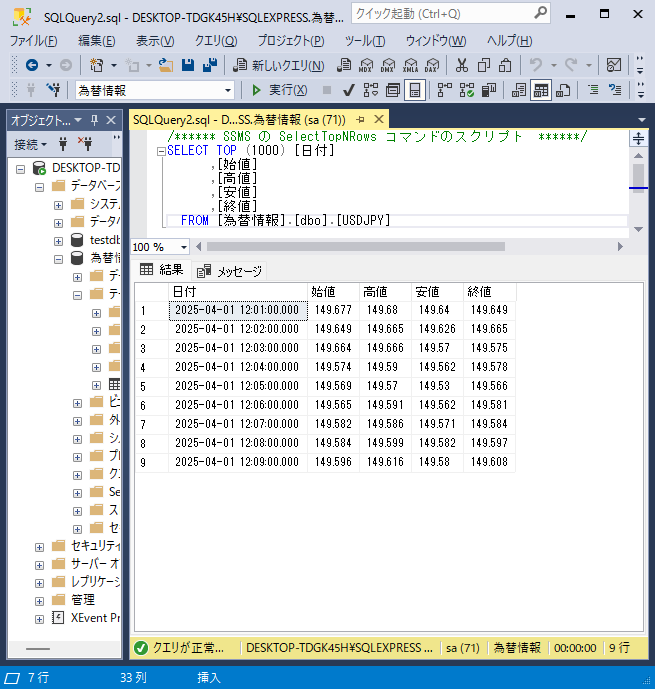 「為替情報」というデータベース及び 「USDJPY」というテーブルが既に存在していること